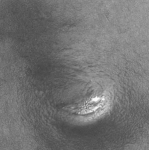 It is too bad this object is partially covered, otherwise we could tell a lot more about it. But, when we look very closely, we can be pretty sure this is a circular anomaly of some kind. Whatever the seemingly "broken" white pieces are in the interior of the object's "face", one can just make out other "points" of the "covered white pieces" coming to the center from the covered side. This would indicate that the rounding of the "face" continues under the covering, and, on that basis, one might "assume" that this is more like a circular object.
