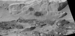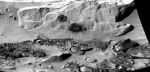 However, if you look at where it is in relation to the Rover, it looks to me as if it could be a RAT effort on the rock. Normally, the RAT makes a single roughly circular patch but this isn't so I dont know if it is caused by that. The "shading" around the outside makes it look like that might be sandings from the grinder. I dont see it as anything off the surface of the rock, but maybe it is. Take a look at other RAT places whre they have done sampling and smoothing and see if you think this is what it might be.