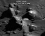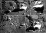 This series of slides show a range of anomalies slightly apart but it the same general location. Two of the anomalies appear to me to be rings or discs of some sort stationed on top of large rocks and two other seem to be vehicle type anomalies. The main anomaly however is intriguing as it seems to be a machine holding either a rock or something else which has received the  obscuration treatment. Just 'standing' to the right side of this machine like anomaly appears to be the upper bodies of 2 figures. Of course this image has been highly magnified and I do not expect everyone to agree. I am happy for members to give me their view even if it proves the opposite. Please take a look at the original image on the LROC Act React website.
