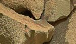 This stretched image shows the three 'things' along the spine of the rock and the left hand one appears to have markings or two white blobs on it. Dont know if this is to do with the stretching of the image or not. All three are clearly raised above the 'spine' as they have shadows. Now, they could be harder pieces of rock just like the other pieces sticking out at other places. It is just strange that these three all appear almost perfectly positioned along the spine of the rock.
