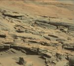 Imho it is just part of the terrain, what has my attention is the upright dark spike in the centre of your first image, the shadow it cast is the opposite to the other shadows in the image